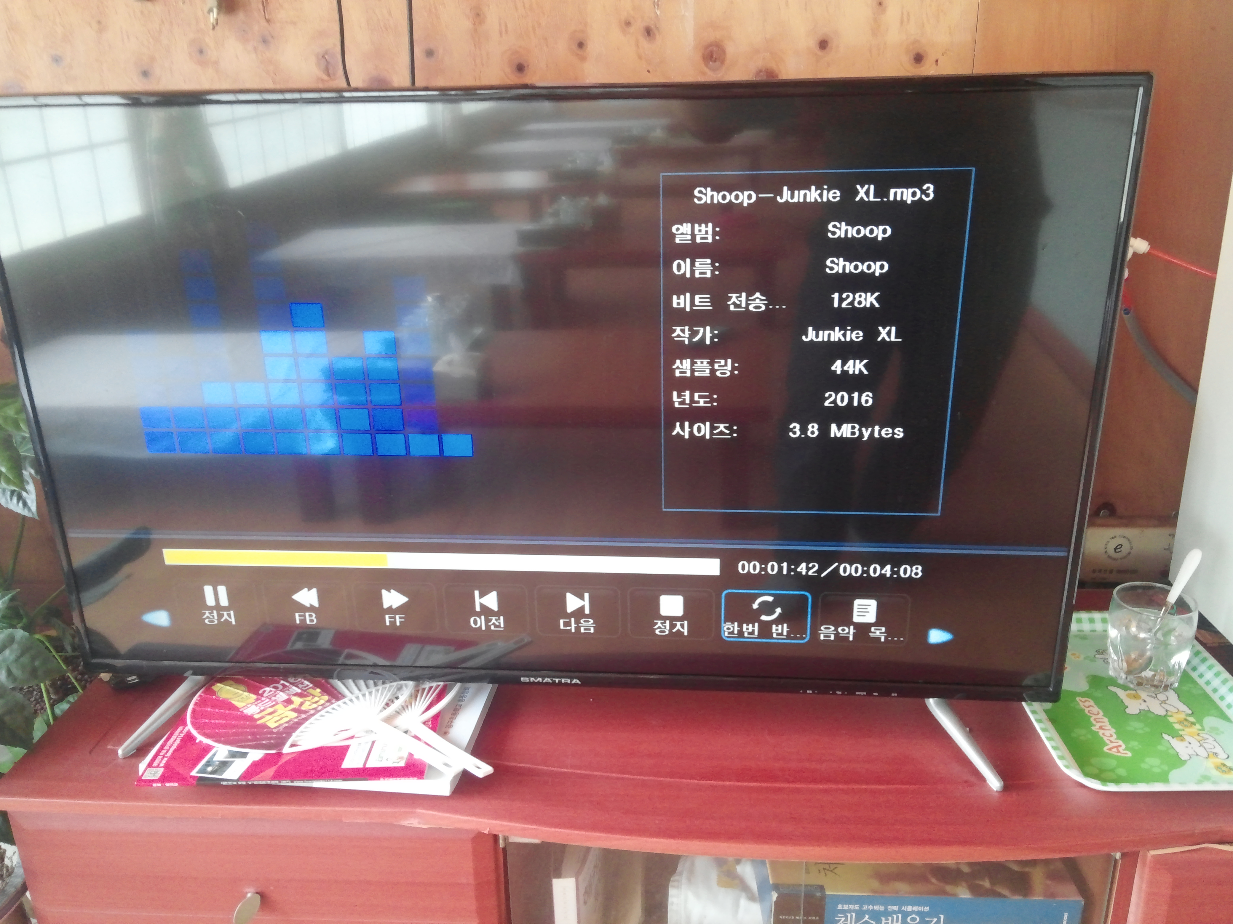 돌비 사운드라 해서 기대했는데, g2보다 사운드가 더 못한 것 같다. 소리가 생동감이 없고 뭔가 꽉 막힌 그런 느낌이었다. 물론 mp3 파일 자체가 문제 일 수도 있으니... tv 볼 때는 사운드가 괜찮은 것 같은데 mp3 재생에서는 돌비 사운드라는 명성에 먹칠하는 것 같다. 또한 인터페이스에도 문제가 있는데, 랜덤 재생이 없다. 지금 사진에서 한번 반이라고 표시되어 있는데 '한곡 반복 기능'이다. 글자 해석 해 놓은 것도 그렇고 뭔가 엉성하다. 전기 세를 조금 아끼려 화면만 끌려고 하면, 그 기능은 메뉴-설정-기타 설정에 들어가야 하는데 불편한 것은 아니지만 조금만 신경 써서 리모컨 버튼에 바로가기 기능 하나만 넣었으면 하는 아쉬움이 크다.