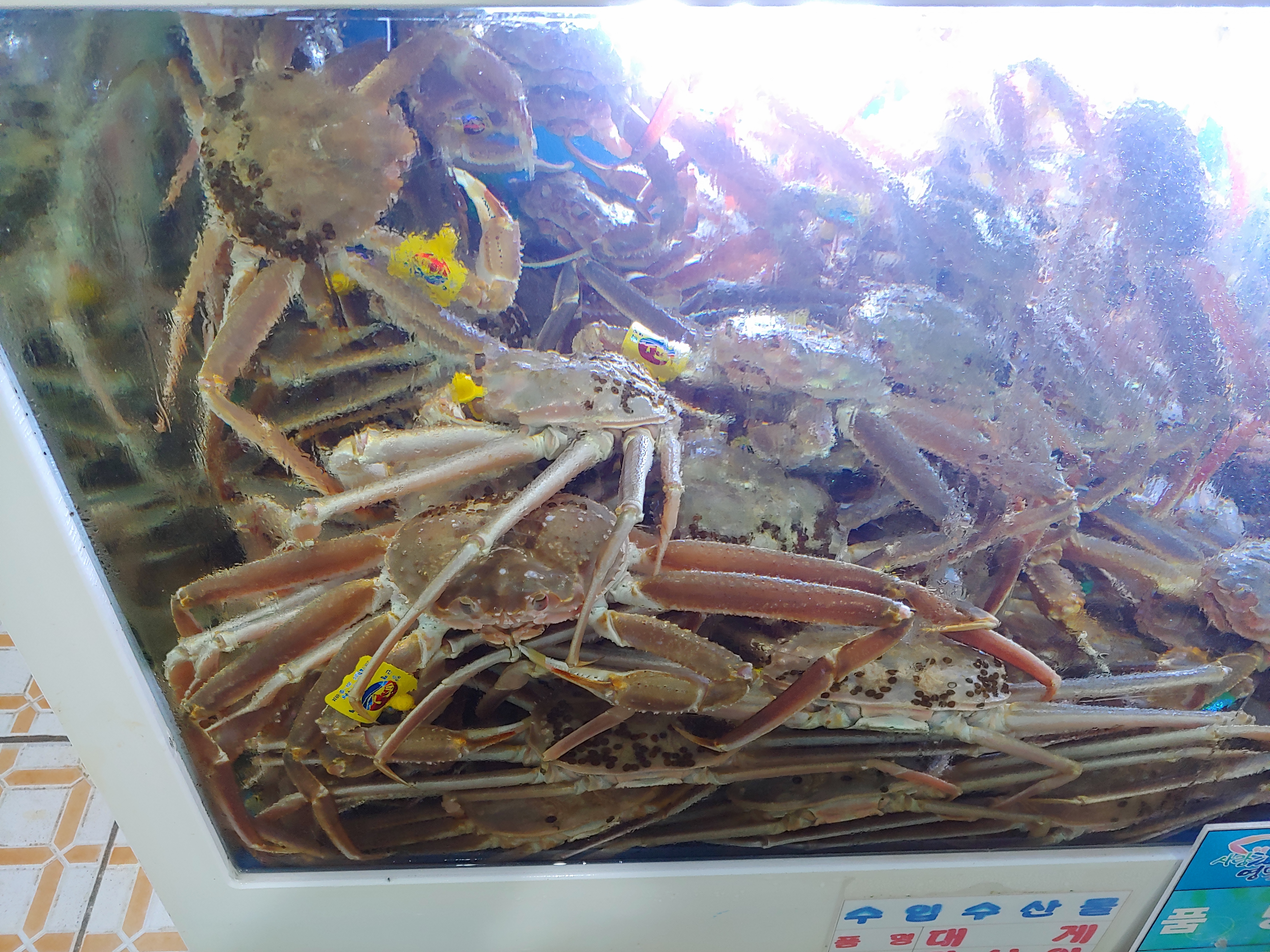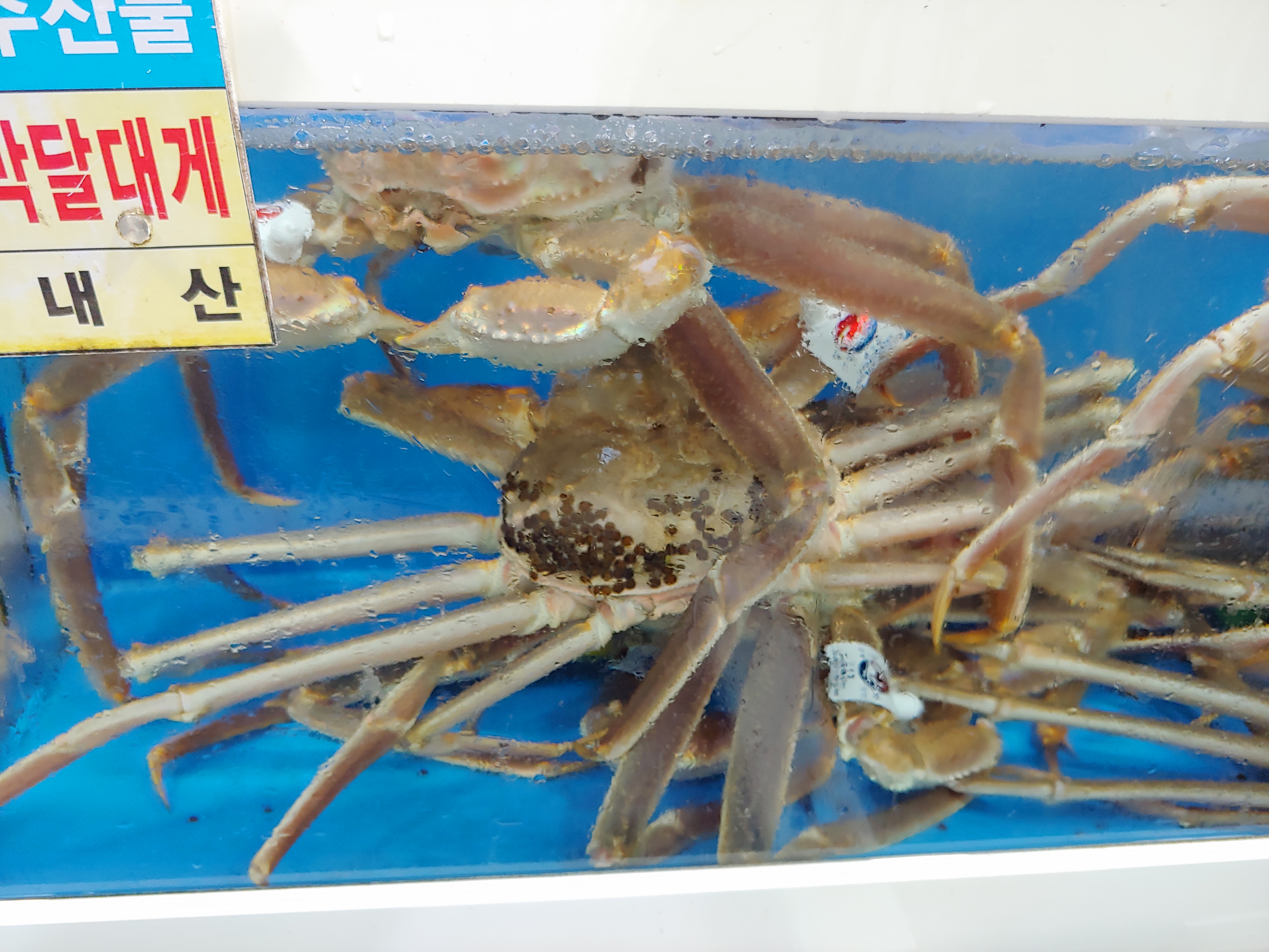 크고, 녹색 라벨(완장) 찬 것은 한 마리 8만 원입니다.(제일 위의 사진의 대게 참조)
