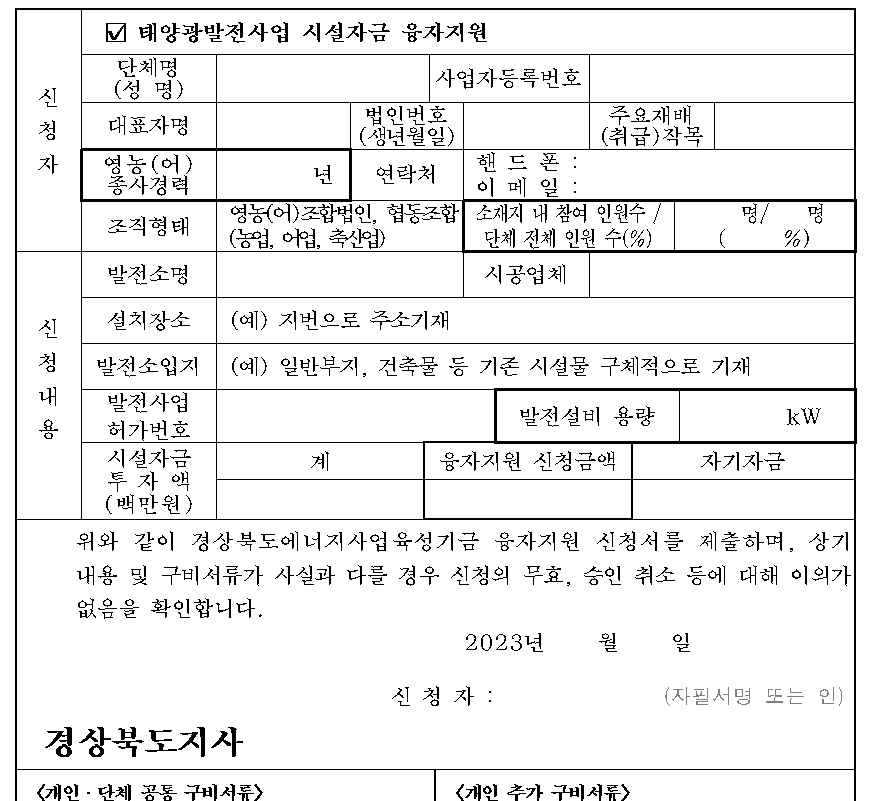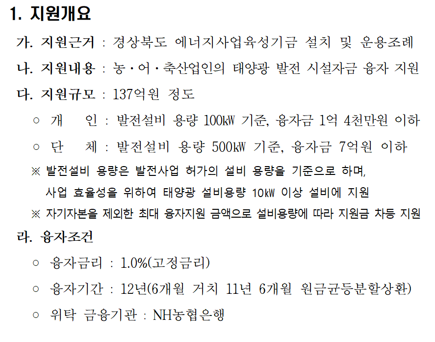 경상북도는 신재생에너지의 확대보급을 통해 기후변화에 선제적으로 대응하고 농어업인의 농외소득 증대를 위해 추진하는 ‘2023년도 햇살에너지농사 융자지원계획’ 을 공고했다고 밝혔다.햇