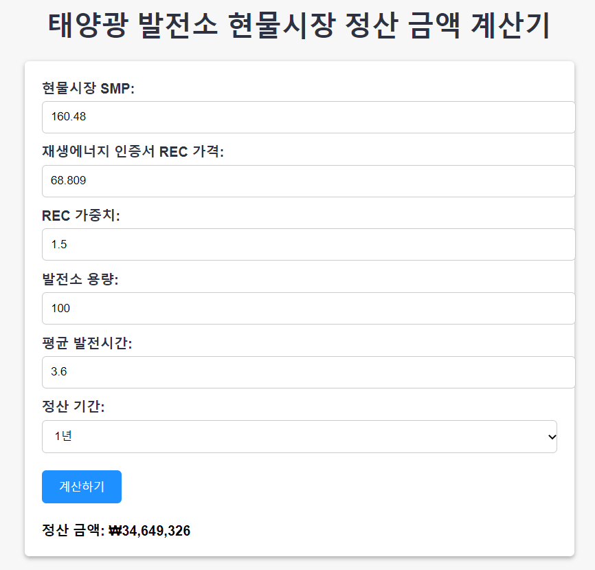 그럼 태양광 100kw 1년 수익은? 34,649,326원....